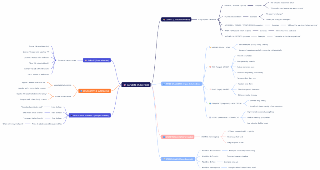 Segue o mapa mental sobre os advérbios em inglês. Para saber sobre veja o artigo completo “Advérbios em inglês“.